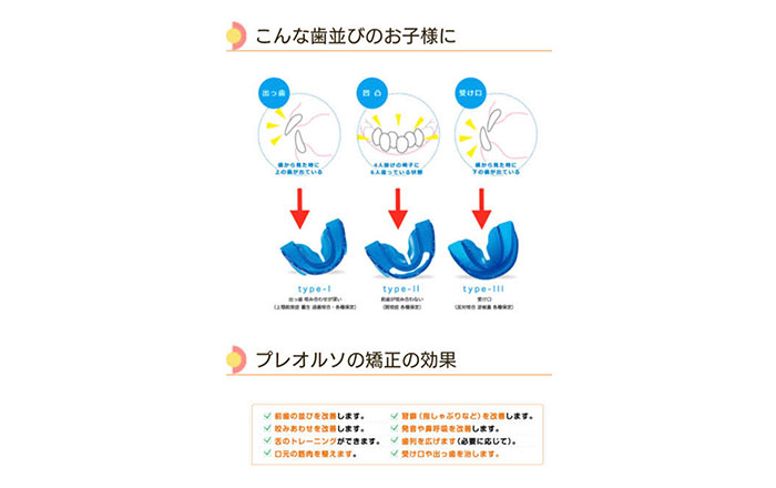 プレオルソとは、子どもの歯並びや噛み合わせを改善するための「マウスピース型矯正装置」です。特に、4歳〜10歳くらいの成長期の子どもに使用されることが多く、従来のワイヤー矯正とは異なり、取り外しが可能で、主に日中の数時間と就寝時に装着します。