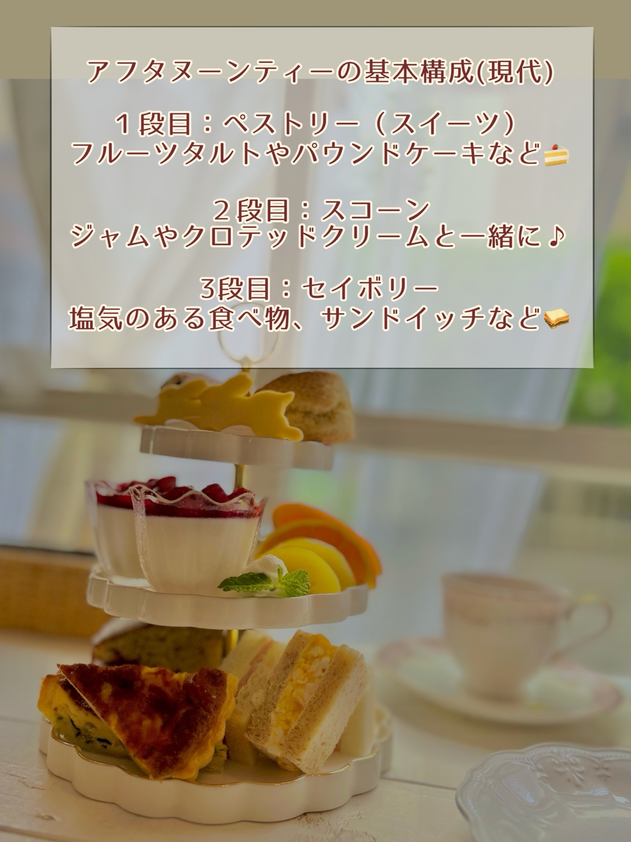 現在のアフタヌーンティーでは3段構成のスタンドで提供されるのが主流で、以下のような構成になっています📎