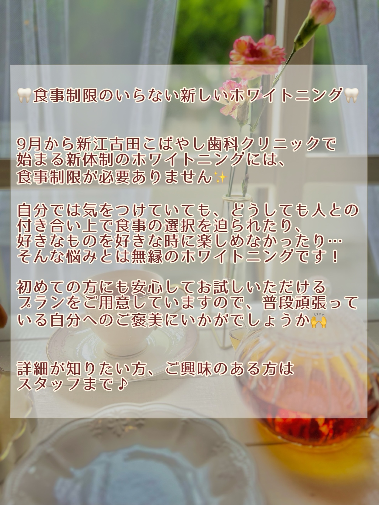 実は、9月から当院で始まる新体制のホワイトニングには、食事制限が必要ないんです✨