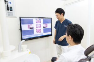 実際に当院では初診時にお撮りするレントゲン資料だけではなく、お口の写真も使用して患者さんに説明を行っています。