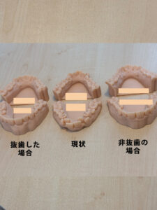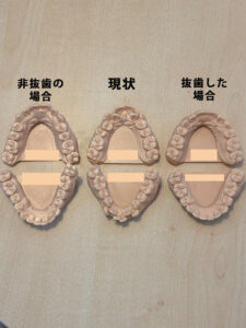 1枚目の真ん中が現状、左が非抜歯、右が抜歯したパターンのシミュレーションになります。