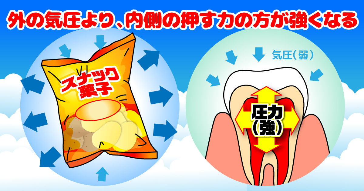 実は、「飛行機に乗ると歯が痛む理由」もこれと同じです。歯の内側には「歯髄腔(しずいくう)」という神経の詰まった空洞があります。気圧が下がるとスナック菓子の袋と同じように、内側の圧力のほうが強くなり、歯の痛みを引き起こしてしまうのです。