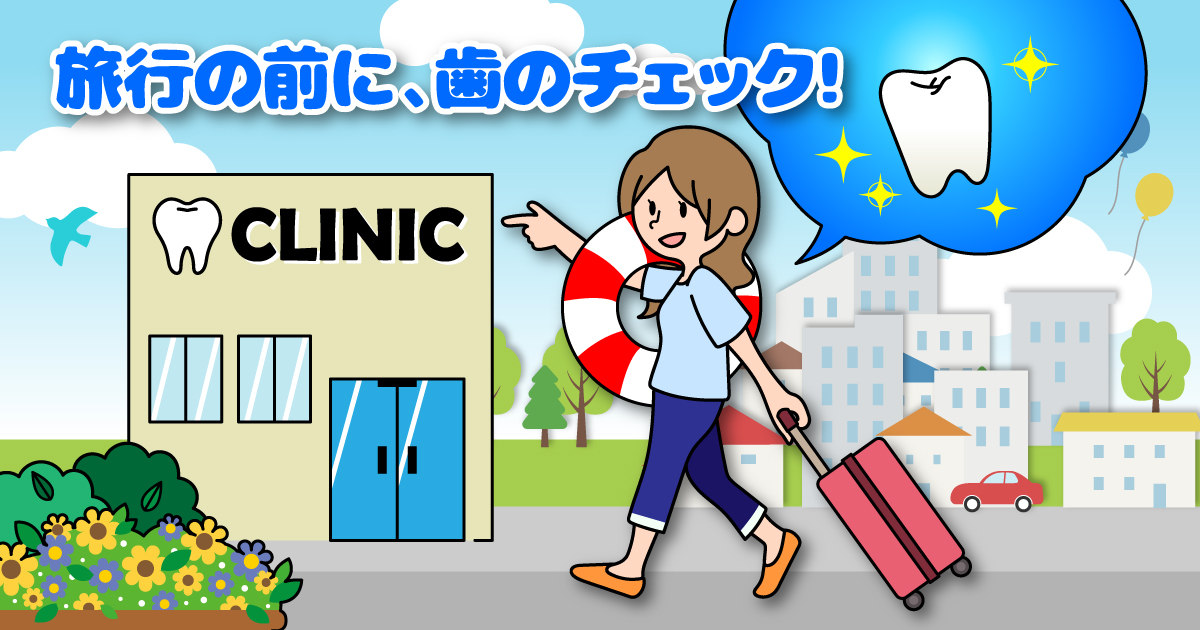 もし、これから旅行やレジャーへ行くにも関わらず、治療が必要な歯や、治療中の歯を放置している方、また「しばらく歯科を受診していない」という方は、楽しい思い出を作るためにも、事前に歯科で検診を受けておくことをお勧めいたします。