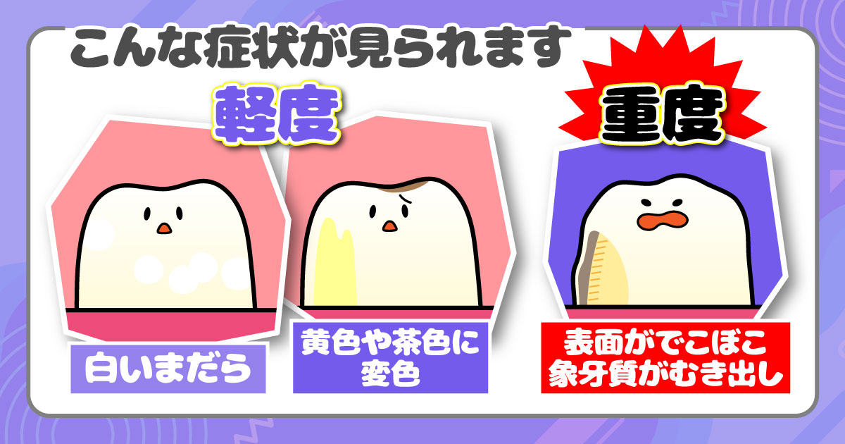 また、重度の場合は歯の表面がデコボコしたり、歯を覆うエナメル質がないため、象牙質がむき出しになってしまいます。