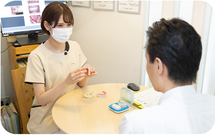 歯科医師のたてた治療計画を元に、患者様が不安・疑問に思うこと、詳しく知りたいこと、などを患者様の立場にたって相談していただきます。
